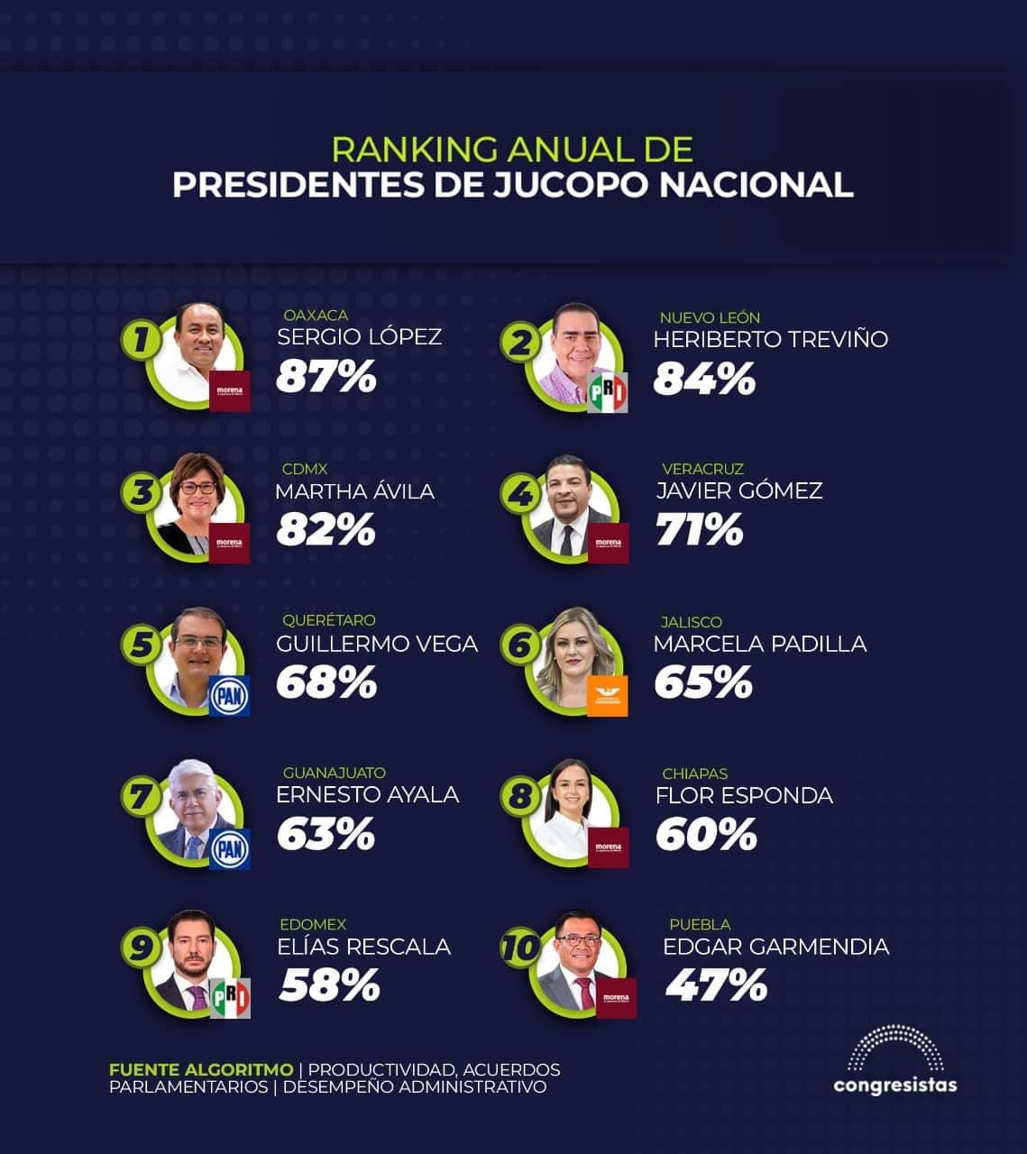 El listado de los 10 mejores líderes de las Juntas de Coordinación Política de los congresos locales está encabezado por Sergio López Sánchez (Morena-Oaxaca), seguido por Heriberto Treviño Cantú (PRI-Nuevo León); Martha Ávila (Morena-CDMX); Juan Javier Gómez Cazarín (Morena-Veracruz); Guillermo Vega (PAN-Querétaro); Marcela Padilla (MC-Jalisco); Ernesto Ayala (PAN-Guanajuato); Flor Esponda (Morena-Chiapas); Elías Rescala (PRI-Edomex), y Edgar Garmendia (Morena-Puebla).