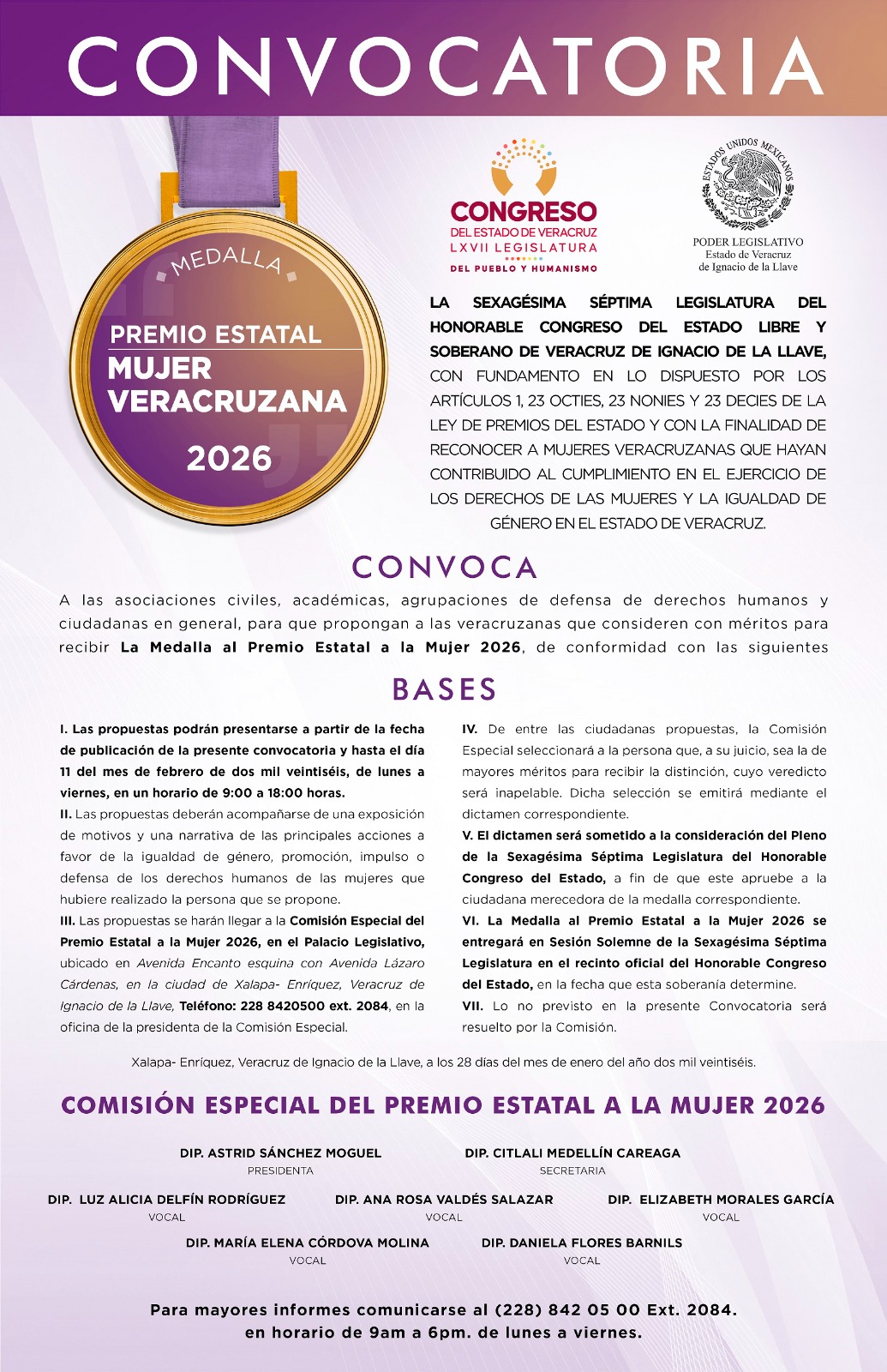 Xalapa, Ver., 29 de enero de 2026.- Con el objetivo de reconocer a las veracruzanas destacadas por su trayectoria de vida, obra, méritos académicos, científicos, artísticos, literarios o de otra índole, o que desde cualquier ámbito de acción hayan contribuido al cumplimiento en el ejercicio de los derechos de las mujeres y la igualdad de género en el estado, la Comisión Especial del Premio Estatal a la Mujer 2026 dio a conocer la convocatoria para elegir a la acreedora a esta distinción que el Congreso del Estado otorga anualmente.