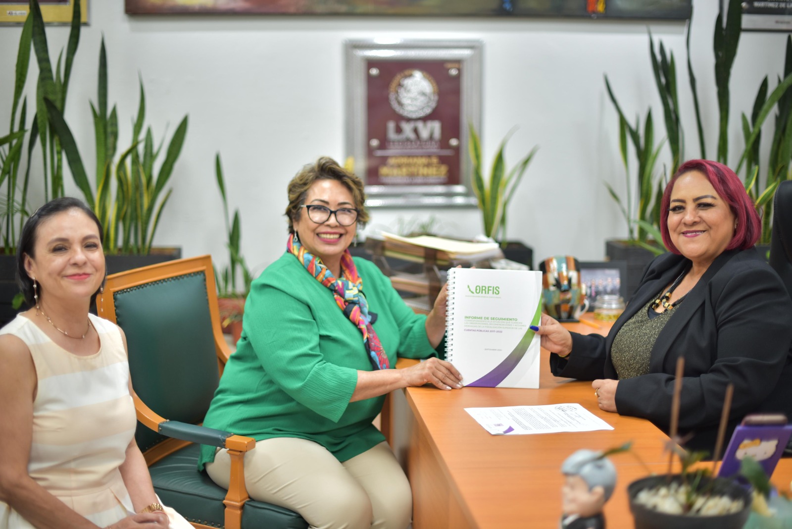 La LXVI Legislatura del estado, por conducto de su presidenta, diputada Adriana Esther Martínez Sánchez, recibió de la titular del Órgano de Fiscalización Superior del Estado (Orfis), auditora Delia González Cobos, el informe de seguimiento a la situación que guardan las observaciones, recomendaciones y acciones promovidas de la Fiscalización Superior de las Cuentas Públicas 2017-2022.